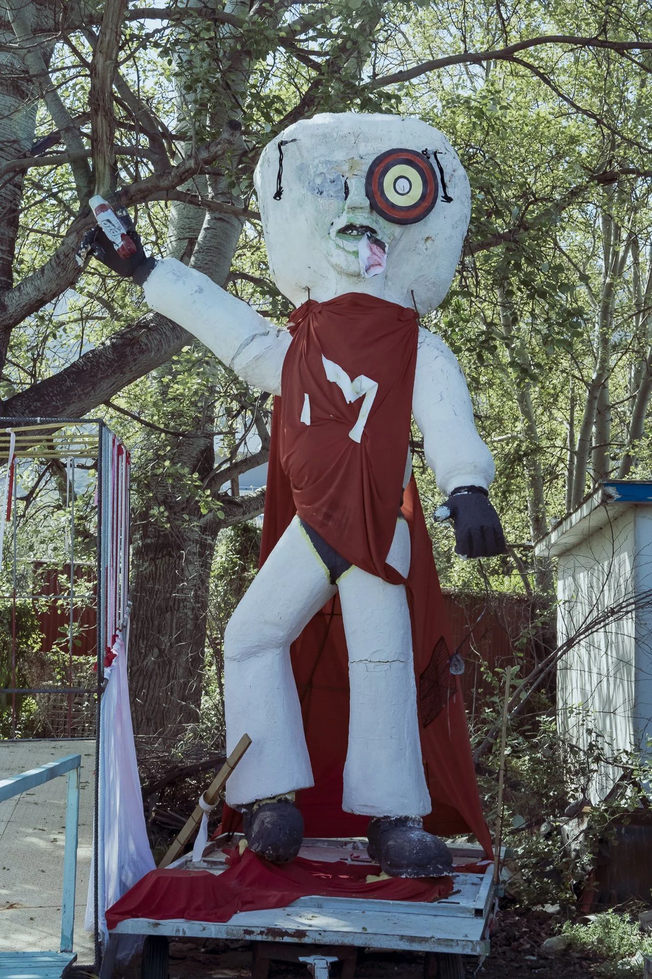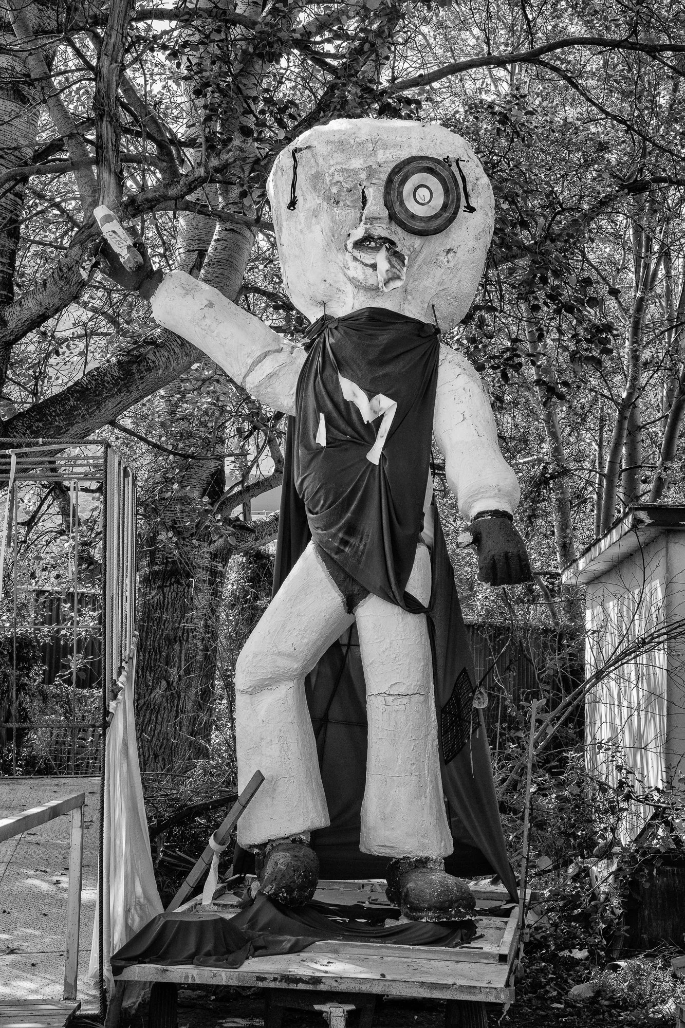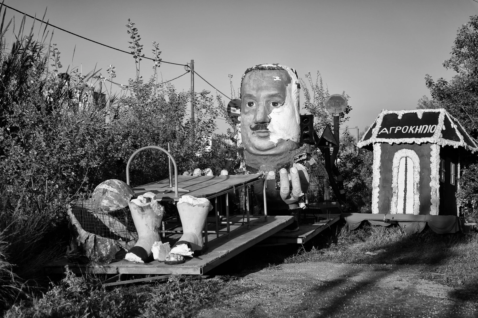 The carnival characters were placed unceremoniously inside a chain-linked fence, on a small lot anchored by an abandoned one-story building. The neglected overgrown parcel, neighbored by a small apartment building on one side and a rumbling industrial street on the other, failed to garner any attention from Cretan truck drivers and commuters grinding through their day. Me, merely a curious traveler with time on his hands, pulled over.